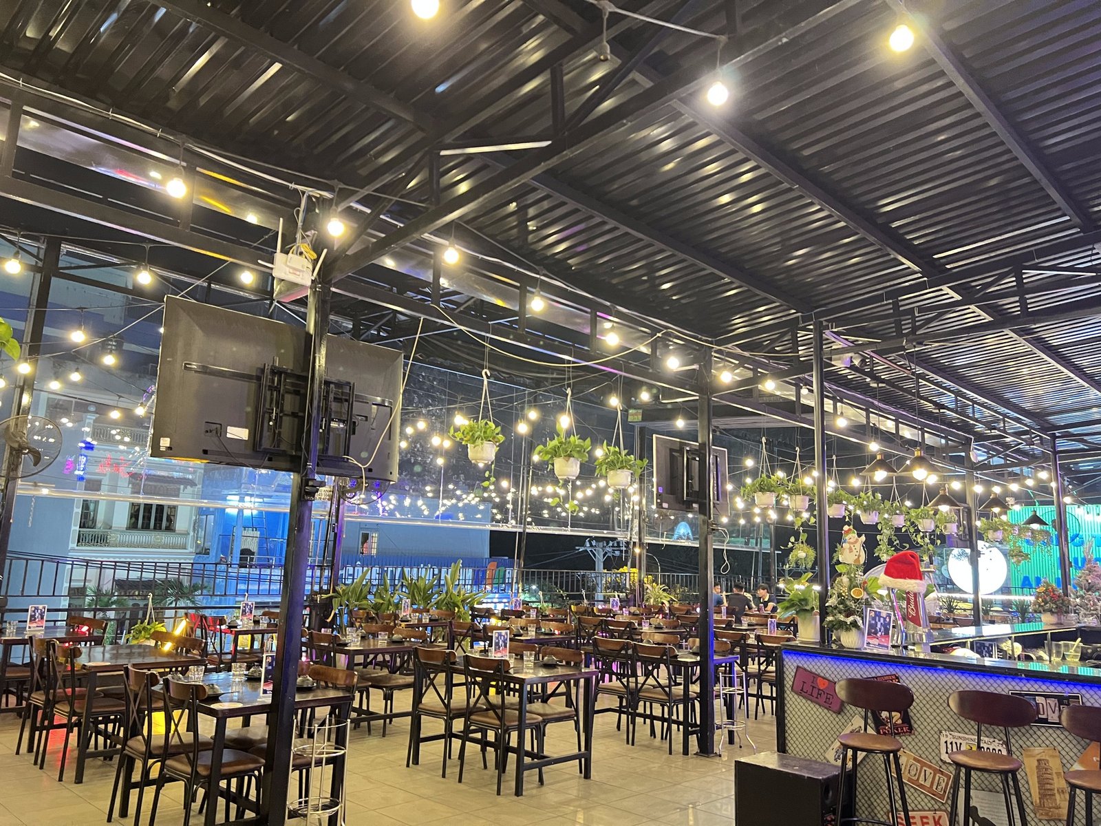 😍Tui thề là tui ghiền cái không gian dã man luôn á. Quán này là quán rooftop nhe, cái kiểu decor mang phong cách đường phố gắn các bảng xe, bảng hiệu, trang trí thêm dây đèn kèm với khá nhìu đèn led màu sắc làm cho quán cực kì bắt mắt. Điểm cộng thêm cho quán có nguyên có mấy cái góc sống ảo sương khói mờ nhân ảnh =)))) hứa là mấy bà về là có cả đống hình đăng dần cho tới Tết.