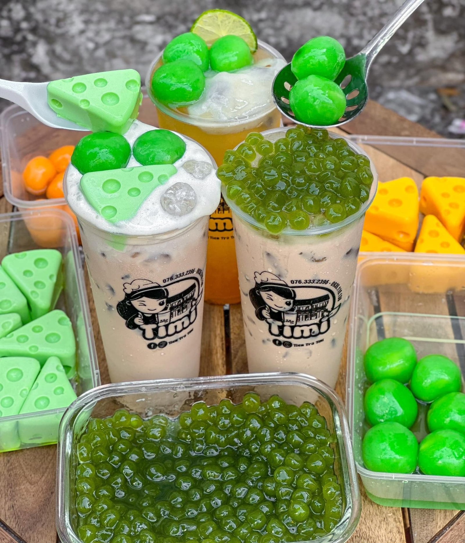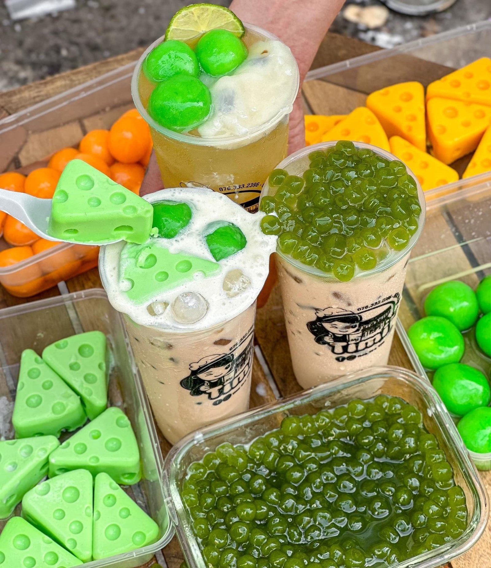 Phô mai khoai dẻo trà xanh dai dai dẻo dẻo , phô mai jerry xanh lá béo béo thơm thơm, còn trân chân matcha nhai cực đã hé, olong sữa lài thơm lém é, có cả trà mãng cầu thanh mát chua chua ngọt ngọt mờ ê mê :))) ngoài ra ly trà sữa trân châu đen 24 cành à.